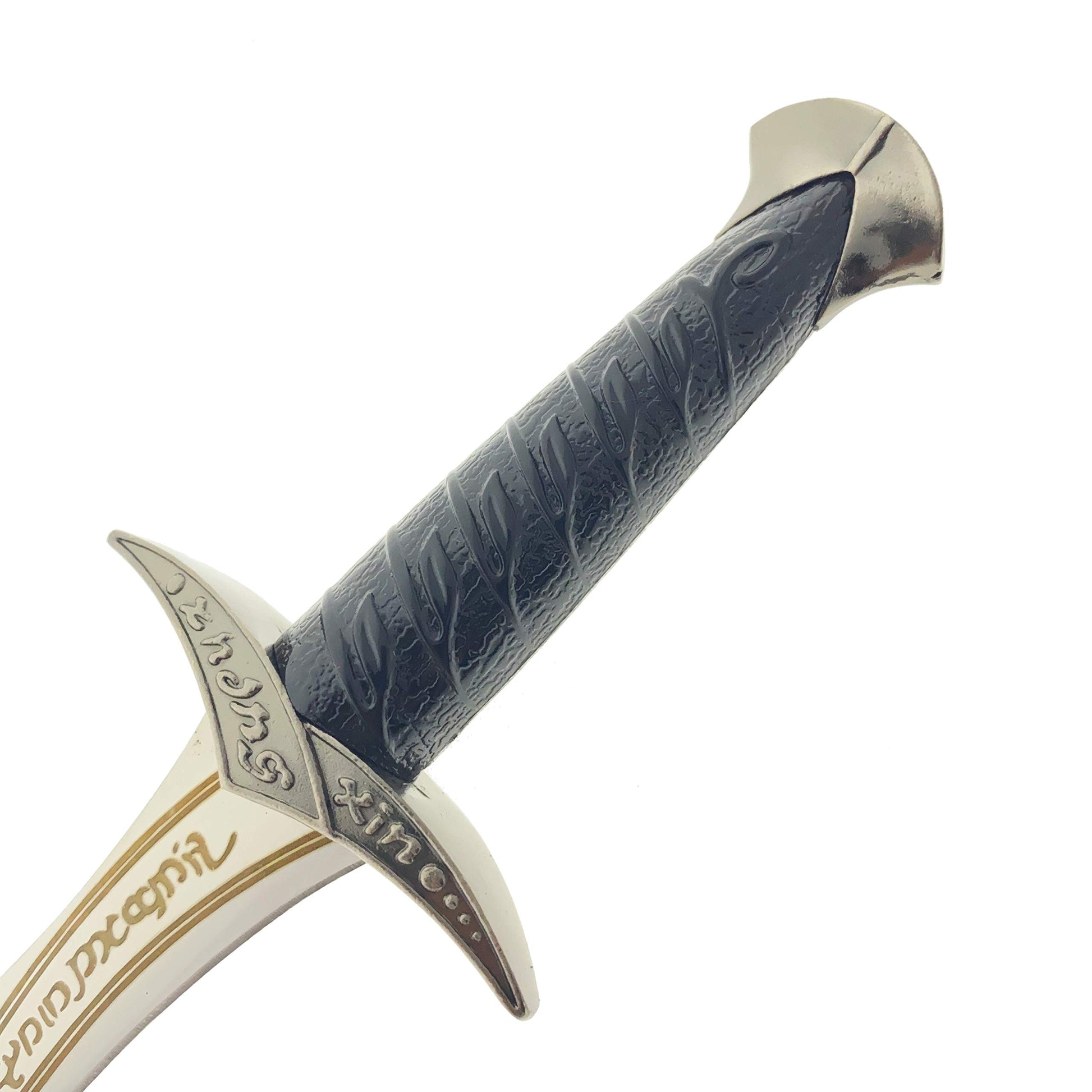 The dagger features a stainless steel blade with a zinc alloy hilt, finished with intricate elvish-style engravings. It’s designed for display and cosplay — not for functional use.